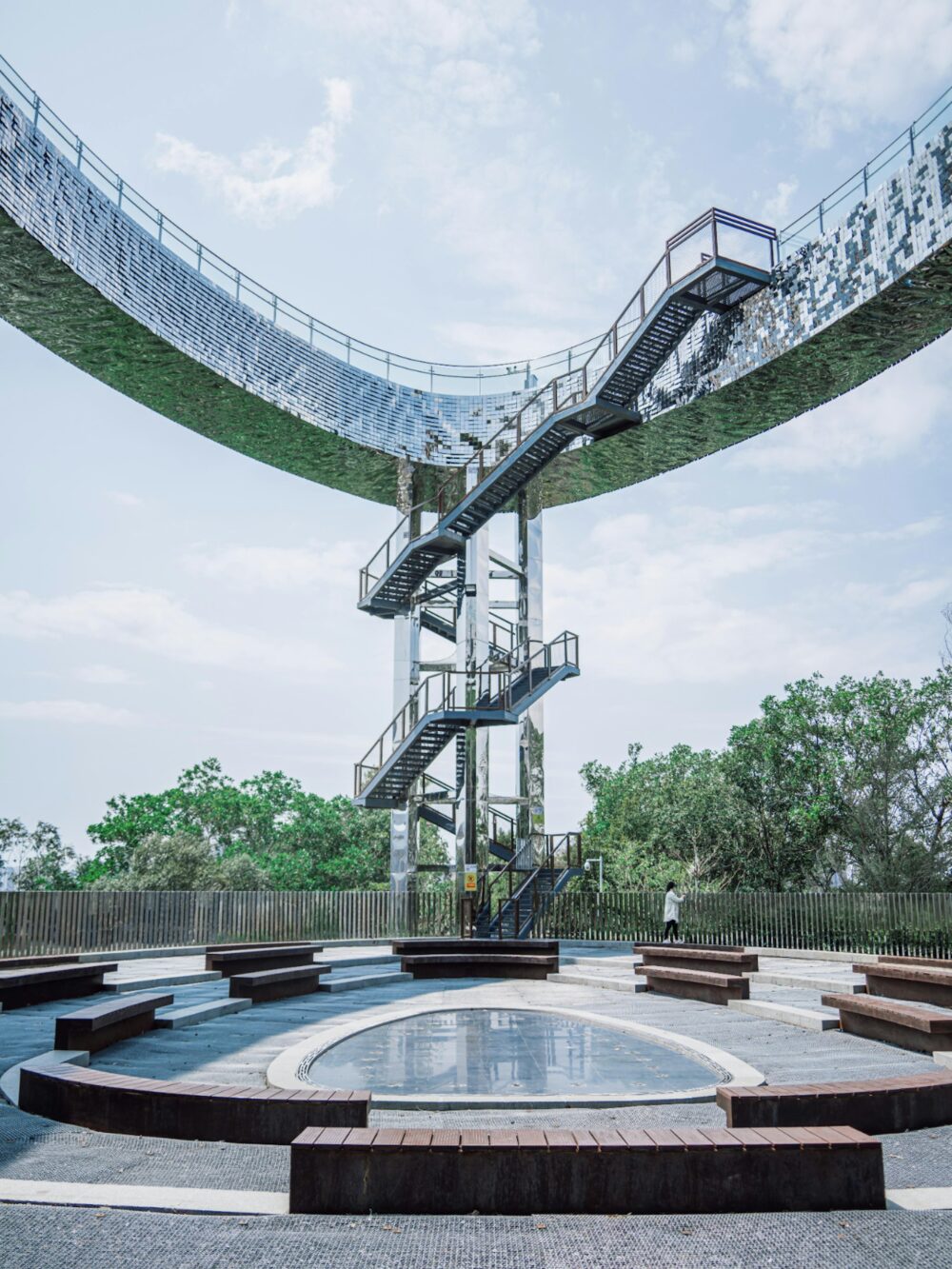 一去到最搶眼一定係條號稱「天空之盾」嘅觀景樓梯!成個結構都用咗不鏽鋼同鏡面設計,完美反射晒天空嘅藍天白雲☁️,行上去就好似一步步走入天空之城咁,充滿Cyberpunk嘅未來感,超級震撼!