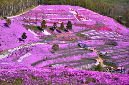 芝櫻種植在山丘上,形成 起伏的粉紅波浪,視覺層次豐富。