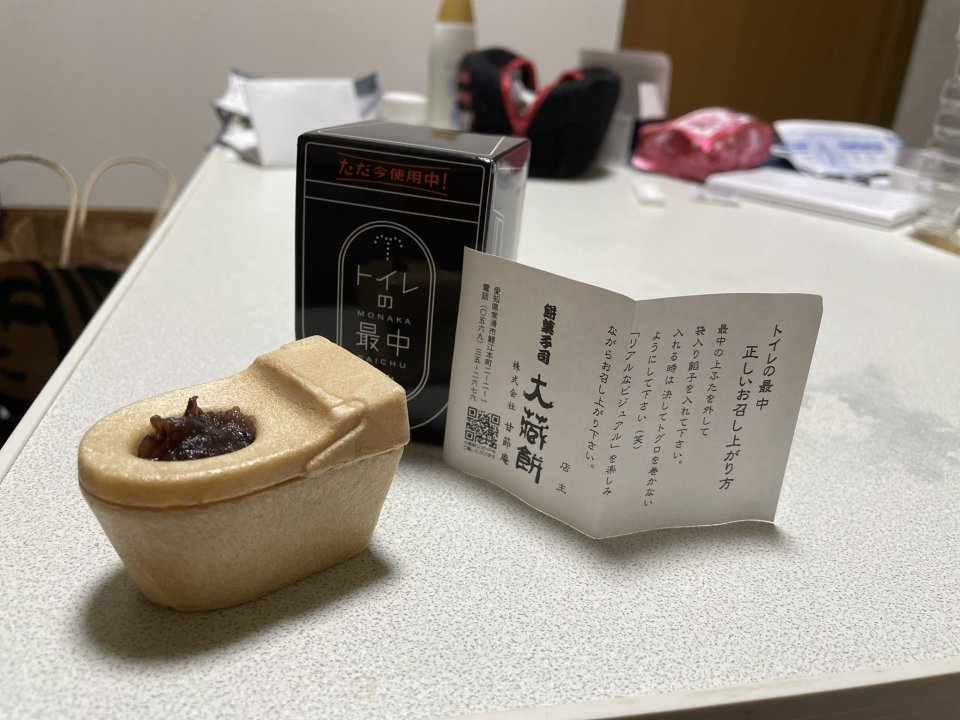 愛知縣常滑市老字號「大蔵餅」推出嘅「馬桶最中餅」。呢款和菓子將傳統最中餅嘅糯米餅皮做成超像真嘅馬桶造型,連馬桶蓋都可以掀開。最衝擊嘅係,食客要親手將獨立包裝嘅紅豆餡擠入「馬桶」裡面,見到紅豆蓉瀉出嚟嘅畫面,難免令人產生無限聯想。店主仲好幽默咁提醒:「擠嘅時候千萬唔好用螺旋狀啊。」