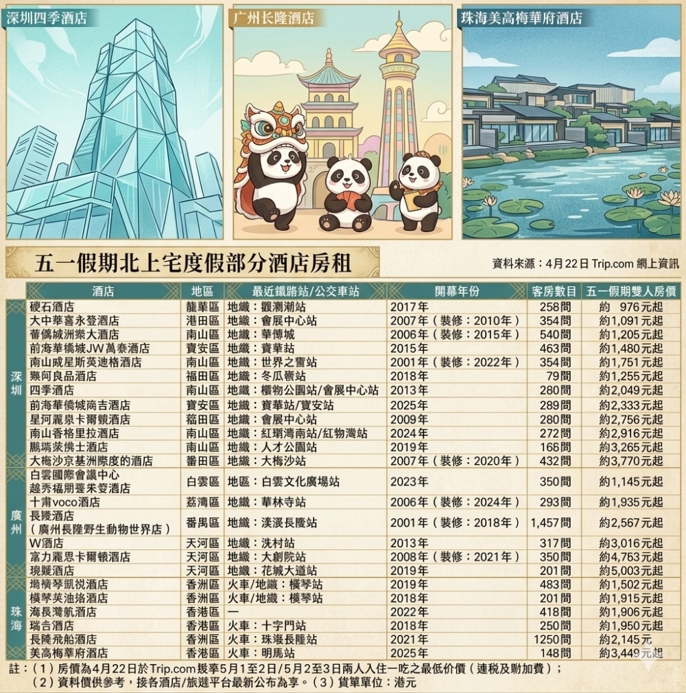 【中國情報】 五一北上度假 內地酒店優惠一覽 性價比超高 慳返幾千蚊! 愛旅遊的電話婷2026-04-232026-04-23 中國情報, 最新旅遊情報 五一假期就快到,想北上玩又怕到處人山人海?其實唔一定要同人逼景點,揀間靚酒店「宅度假」(Staycation),一樣可以放鬆身心,而且內地酒店嘅性價比真係超高! 以下精選幾間特色酒店,部分房價比香港同品牌酒店平超過一半,即刻睇睇: 珠海海泉灣帆酒店|海景+溫泉+親子樂園 賣點:無敵海景、兒童遊樂場及泳池、海洋溫泉,仲可以享用度假區內嘅玩樂設施 5月2日雙人入住參考:約 1,806港元(豪華雙床房) 包啲咩:雙人早餐、無限次海洋溫泉、無限次神秘島親子樂園、夢幻劇場門票 👉 適合家庭客,一個價錢玩齊溫泉同樂園,小朋友放電,大人放鬆! 廣州長隆酒店|動物園+樂園一站式玩樂 賣點:毗鄰長隆野生動物世界、歡樂世界、飛鳥樂園、水上樂園 5月2日雙人入住參考: 純住宿:約 2,597港元 連四園套票:約 3,570港元(包兩日無限暢玩4個樂園) 慳錢貼士:加多約973港元換套票,比自行購買門票更抵(單係動物園週末雙人票已逾600港元) 👉 適合動物迷同玩樂控,住酒店順便玩盡長隆四大園區! 深圳四季酒店|五星級享受,平香港同品牌逾半 5月1日雙人入住參考: 香港四季酒店:逾 6,000港元 深圳四季酒店:約 2,049港元起 慳幾多:平超過3,000港元,差額夠你食多餐豪華大餐! 👉 適合追求高質感住宿嘅情侶或閨蜜,用香港中價酒店嘅價錢,住到國際級五星品牌。 小貼士 網上旅遊平台(如Klook)不時有限時優惠,花時間格價隨時有驚喜。 Klook 網址預訂 Klook 推出限時「全線內地酒店 92 折」優惠(適用至2026年5月3日),輸入優惠碼 CNHOTEL92 最高可減 HK$50。適用於五一黃金週,涵蓋內地所有酒店住宿套餐與普通訂房。此外,指定熱門酒店如深圳硬石、珠海長隆等,更享5至68折及不加價優惠。 如果時間就得到,選擇平日北上,房價會更抵。 訂房時記得留意房價是否包含早餐、門票等額外禮遇,計清楚先至最划算。 五一唔想同人逼,又想去個短途旅行?北上宅度假絕對係一個高性價比嘅選擇!無論係家庭樂、情侶放鬆,定係閨蜜打卡,總有一間酒店啱你心水。 ★不想錯過任何旅遊優惠資訊?加入【我想去旅行優惠群組】★ 我想去旅行優惠群組 想無痛計畫旅行 輕鬆訂酒店連機票攞盡優惠? 聯絡我們! 電話: 27830881 電郵: ticket@tungnam.com.hk Whatsapp: +852 56858777 或 按下方按鈕 Line/Wechat: TNT27830881 Whatsapp聯絡我們 推薦文章: 大灣區航空優惠Greater Bay Airlines 香港出發:CATHAY PACIFIC 國泰航空 x 我想去旅行機票優惠 Emirates阿聯酋航空機票優惠 愛旅遊的電話婷鈴…鈐…鈐… 【GOGOAdvise Travel旅遊日記 現在徵稿】 歡迎來稿分享對旅遊、購物、美食、活動既情報。如蒙投稿,請寄 aeronautmediacompany@gmail.com,另請附上照片一張及不多於80字撰稿人簡介,撰稿人可用真名或筆名。文章一經採用,或會將由Travel旅遊日記編輯部作潤飾,及會開設作者個人專欄。
