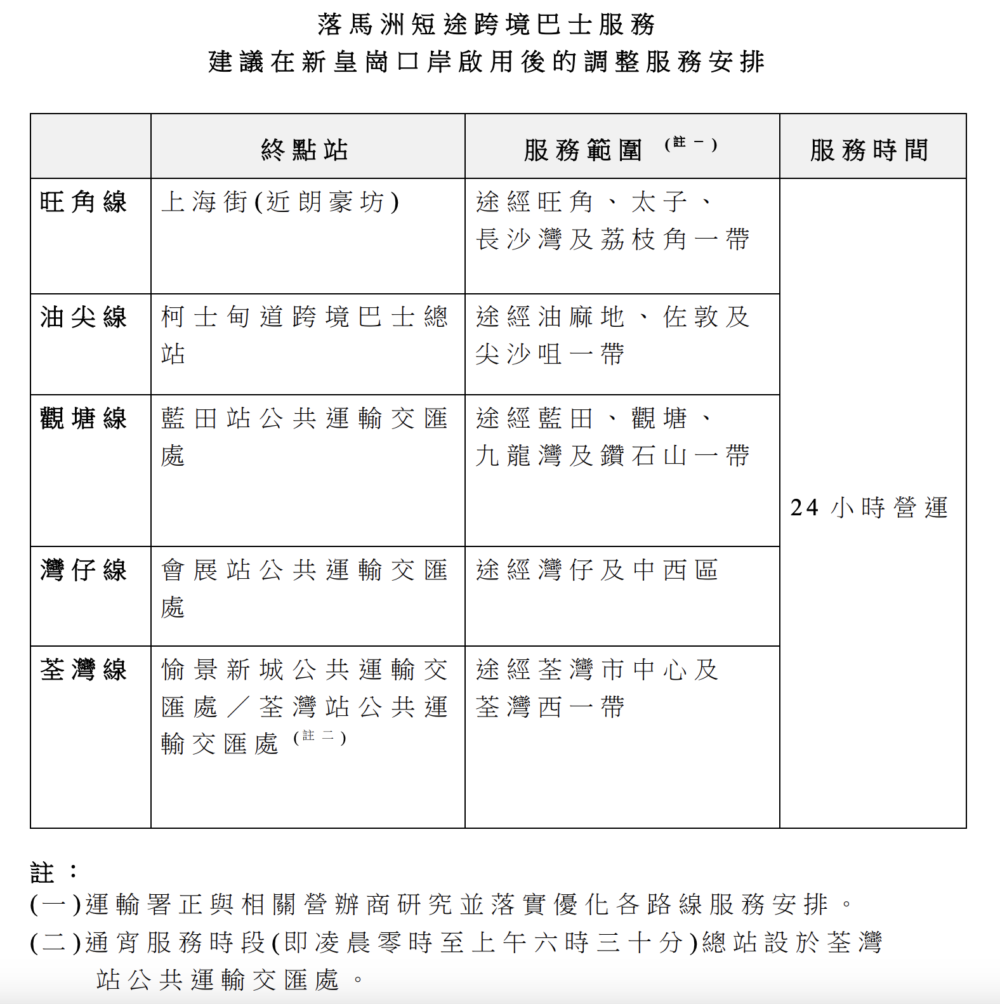 備註:專線小巴現時以新田公共運輸交匯處或落馬洲管制站為終點,新皇崗口岸啟用後預計將陸續整合或延長至新口岸。