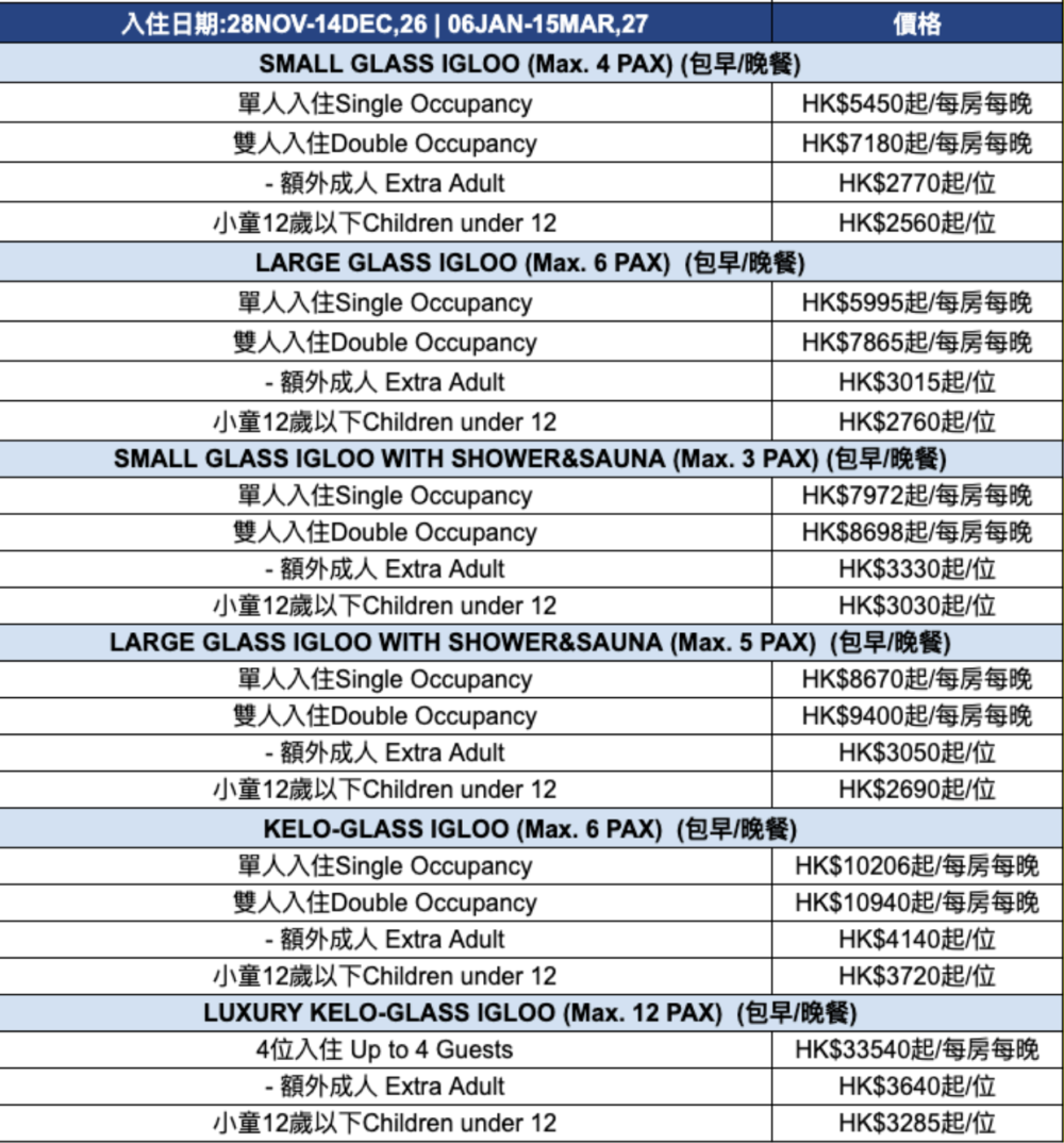 *記得提早預訂冬季活動 Kakslauttanen 冬季活動價格表